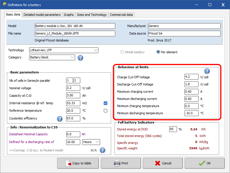 | - | Maximum discharge current. This parameter is usually taken from datasheets. It can be modified for cells available in the internal database: PVSyst applies a consistency-check of the voltage model, and if the discharge voltage at minimum temperature and maximum discharge current falls below the discharge cut-off voltage, then the maximum discharge current will be limited. This mechanism keeps the coherency of the whole dataset. |