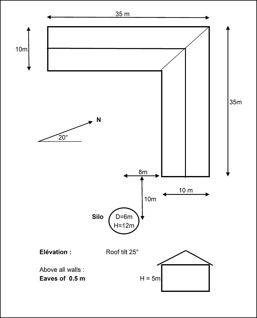 - You have to define the sizes: "Nb of rectangles" = 1 (you could define several non-interpenetrating rectangles in the same plane), "Tilt" = 25°, "Width" = 5.5 m, "Length" = 25 m.