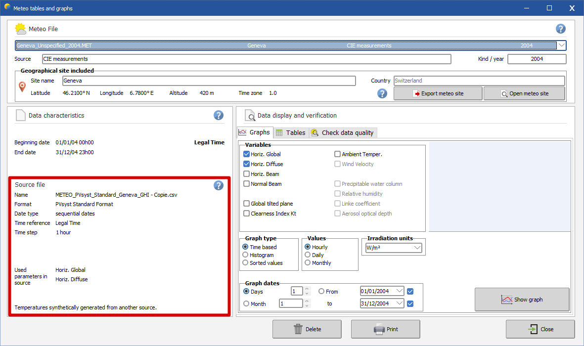 | The source file section of the interface indicates what data originates from the source and what the parameters coming from other sources are. It is, for instance, still quite common for the hourly temperature to not be available. When this occurs PVSyst mentions the origin of the external field. |