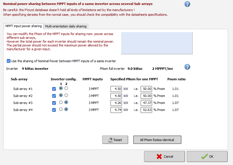 Be careful: as in the PVsyst inverter database, there is no information about the maximum power (or current) for each individual MPPT input, it is your responsibility to check in the data sheets whether the allocated power is compatible with the manufacturer's specifications. PVsyst puts a general limit to the sharing ratio, which is modifiable in the Hidden parameters.